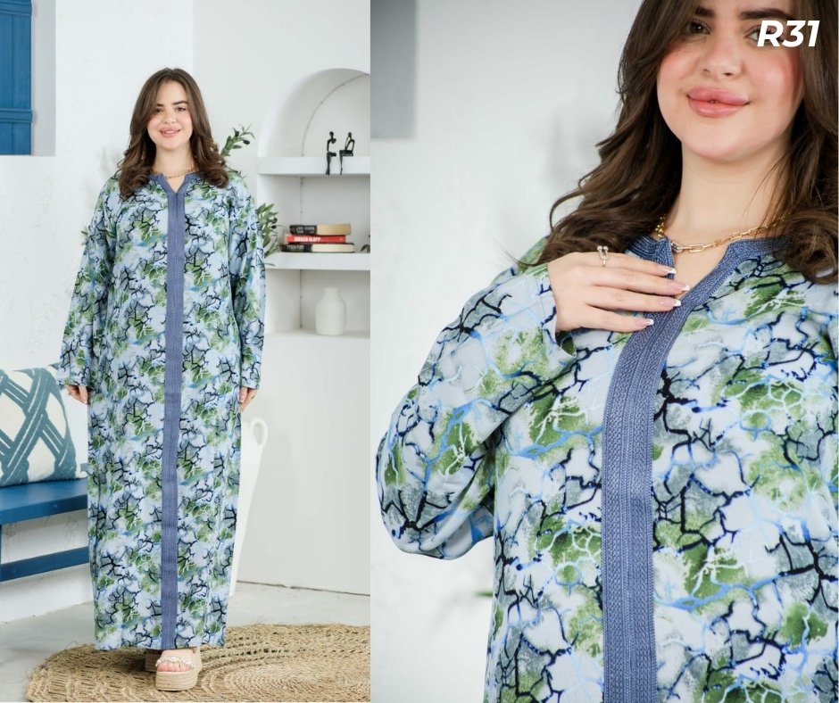 La robe R31 ferme la collection avec panache. Son imprimé abstrait imite les craquelures de la terre sèche dans une palette apaisante de bleu ciel, vert naturel et blanc. Le galon tressé denim bleu apporte une modernité urbaine bienvenue. Une pièce qui incarne la beauté de la nature dans toute sa complexité.