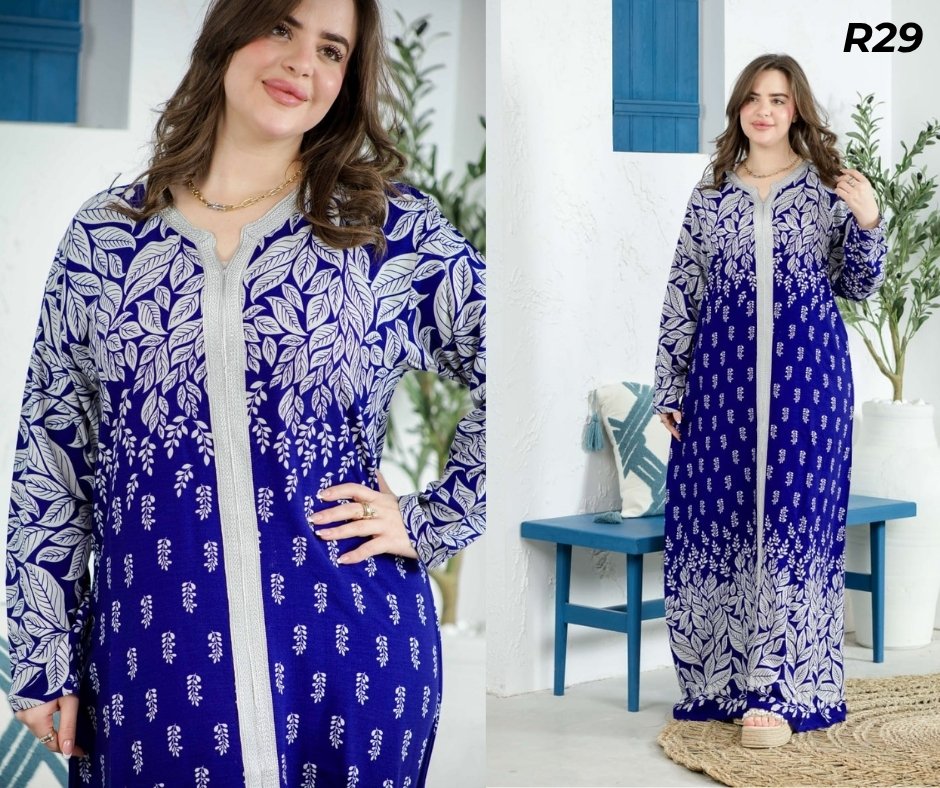 Robe Longue Fibrane Feuilles Dégradées Bleu Royal et Blanc – Galon Argenté | R29