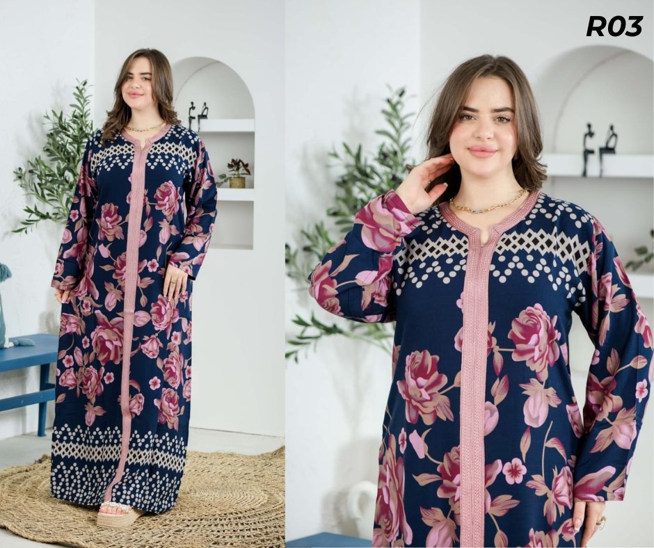 Romantique et féminine, la robe R03 présente un fond bleu marine profond sublimé par de grandes roses roses et des touches florales délicates. Le galon brodé rose qui parcourt toute la longueur donne un aspect romantique et raffiné. Une pièce parfaite pour les sorties comme pour la maison.